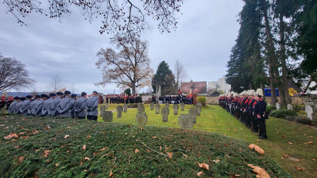 Wie jedes Jahr nahm die Bürgerwache an der Gedenkfeier zum Volkstrauertag am 16. November 2025 auf dem Klausenfriedhof teil. Bürgerwache und die weiteren beteiligten Vereine und Vereinigung wurden heuer von einem stattlichen Ehrenzug des Jägerbataillons 292 begleitet, mit dem die Stadt Rottenburg ein Patenschaftsverhältnis unterhält.